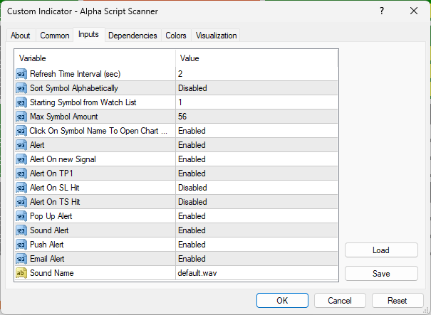 • Double Click on Alpha Script Scanner indicator> Inputs,